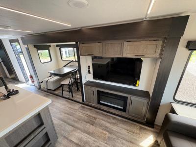 It will be so easy to find comfort in this travel trailer! The dual opposing slides in the combined kitchen and living room will create an open floorplan you are sure to love. There is a rear tri-fold sofa, theater seating across from an entertainment center, plus a table with chairs and a storage ottoman seat to keep games organized. The chef of your group will love having extra counter space provided by the kitchen island, and there is a hutch to keep nice dishes stored away. Up front, the private bedroom includes a king bed slide out, dual wardrobes and a dresser, plus a front sun bench where you can sit to pull your hiking boots on. Nearby is the full bathroom with an ample shower and counterspace in the sink to get in ready in the morning so you don´t have to rely on campsite facilities.