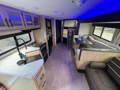 Since this travel trailer features dual entry doors, you can enter in through the rear master bedroom or the front kitchen; how convenient! The kitchen includes ample counter space and all the appliances to prep meals, along with a pantry up front and a hidden pantry behind the fireplace. Your crew can get comfortable on the sofa or play a game around the U-shaped dinette, although you may just find yourselves outdoors since there is an outside kitchen and a power awning with LED lights. The dual entry bath will let you enter in through the main living area, plus it has a private entrance into the bedroom. Here, you'll find an RV king bed, a wardrobe for your things, and USB ports to keep your electronics charged!