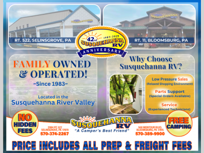 Susquehanna Valley RV is not responsible for any misprints, typos, or errors found in our website pages. Any price listed excludes sales tax, registration tags, and delivery fees to your home or campground. Manufacturer pictures, specifications, and features may be used in place of actual units on our lot. Please contact us @570-374-2267 for availability as our inventory changes rapidly. All calculated payments are an estimate only and do not constitute a commitment that financing or a specific interest rate or term is available.