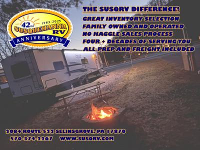 Susquehanna Valley RV is not responsible for any misprints, typos, or errors found in our website pages. Any price listed excludes sales tax, registration tags, and delivery fees to your home or campground. Manufacturer pictures, specifications, and features may be used in place of actual units on our lot. Please contact us @570-374-2267 for availability as our inventory changes rapidly. All calculated payments are an estimate only and do not constitute a commitment that financing or a specific interest rate or term is available.