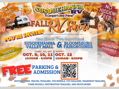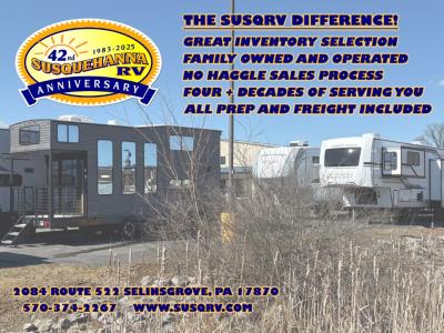 Susquehanna Valley RV is not responsible for any misprints, typos, or errors found in our website pages. Any price listed excludes sales tax, registration tags, and delivery fees to your home or campground. Manufacturer pictures, specifications, and features may be used in place of actual units on our lot. Please contact us @570-374-2267 for availability as our inventory changes rapidly. All calculated payments are an estimate only and do not constitute a commitment that financing or a specific interest rate or term is available.
