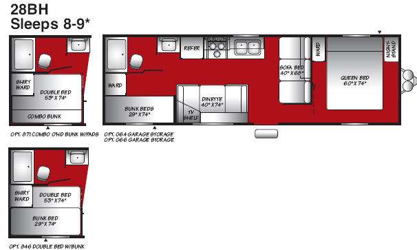 Non-Slide Pioneer Spirit Bunkhouse Travel Trailer w/Rear Corner Bunk Beds w/Lower Double Bed Optional or Combo Double Bed w/Overhead Bunk w/Pads, Opt. Garage Storage w/Opt. 064 or 066, Wardrobe, Rear Corner Bath Including Tub/Shower, Toilet & Lav., Refrigerator, 3 Burner Range w/Microwave Oven, Double Kitchen Sink, Booth Dinette w/TV Shelf Above, Sofa Bed, Front Queen Bed w/Wardrobe & Nightstand, Exterior Storage & More!