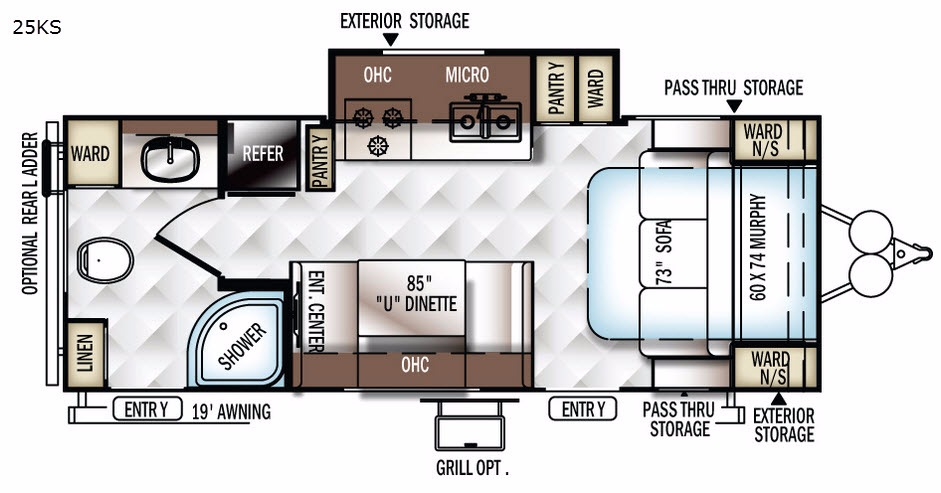 Outside you will find plenty of storage, and you can even choose an optional gas grill and an optional rear ladder, and so much more!