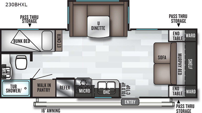 Plan to make plenty of memories with your family while camping in this single slide out Wildwood X-Lite 230BHXL travel trailer. Your kids can enjoy their own sleeping space at the rear set of bunk beds and mom and dad can sleep comfortably on the Murphy Bed. Enjoy your meals at the U-shaped dinette and at night you can even convert this area into additional sleeping space. You will find plenty of storage space throughout this model from the wardrobes, overhead cabinets, and the walk-in pantry. Outside there is a pass through storage area for your exterior camping gear plus a 16' awning!